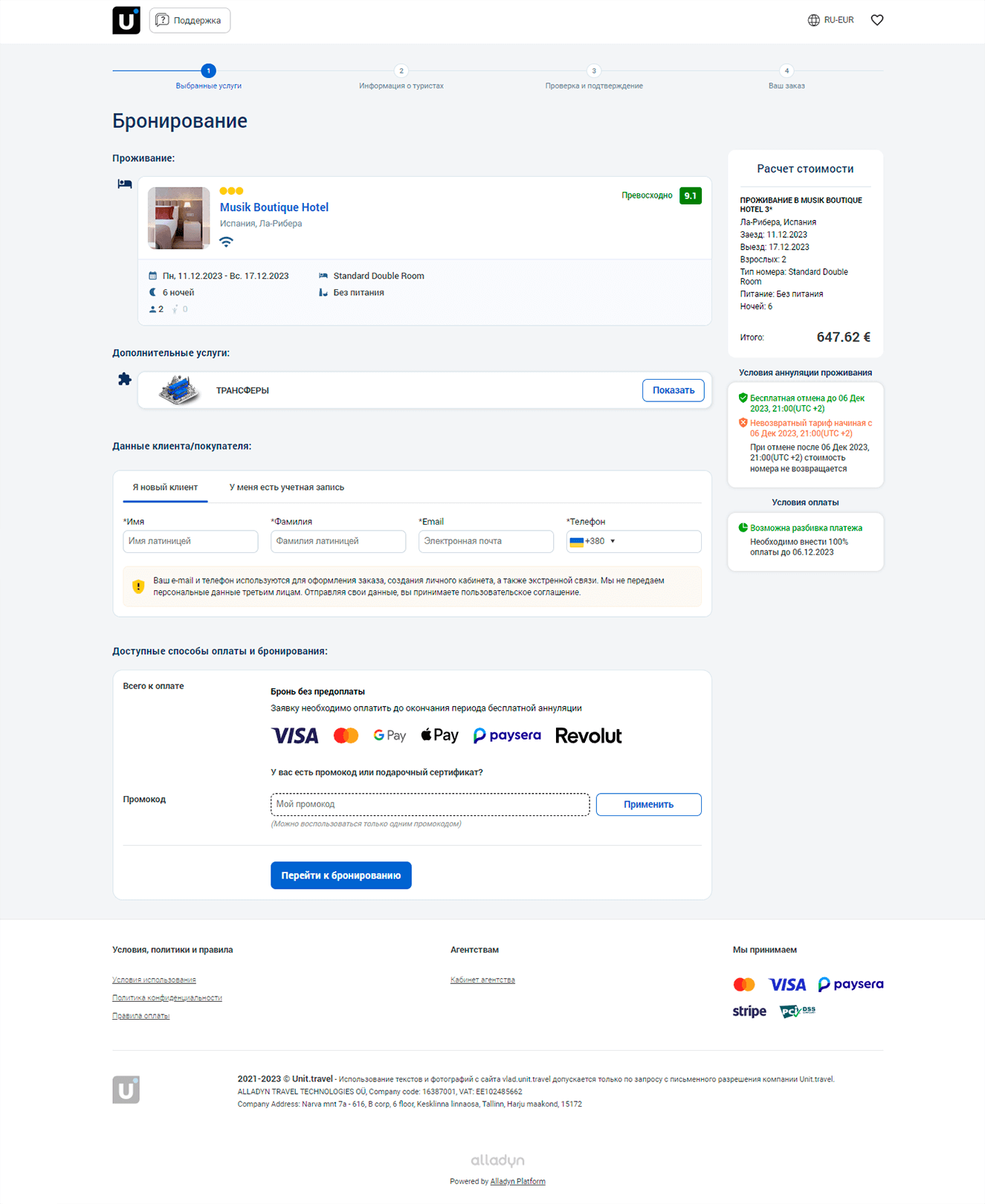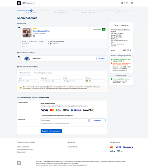 При первом входе или при первом онлайн бронировании клиент создает свой аккаунт в клиентский кабинет. С помощью кабинета ваши клиенты смогут управлять своими заказами, добавлять необходимые услуги, оплачивать созданные вами заявки онлайн, обновлять свой профиль и документы.